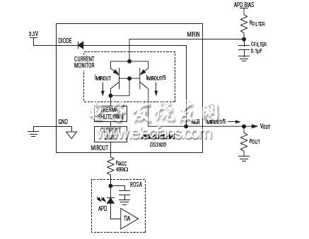 The DS3920 precision current mirror is designed for avalanchephotodiode (APD) and PIN photodiode biasingand monitoring applications. The device offers a currentclamp to limit current through the APD and a current mirroroutput that produces a signal proportional (5:1) to theAPD current. A diode is also provided to limit the voltageat the current mirror output.