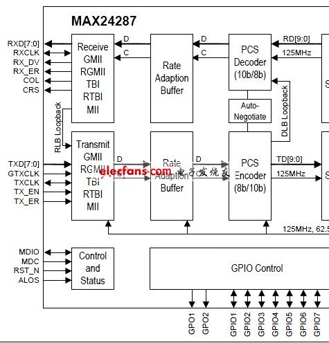 The MAX24287 is a flexible, low-cost Ethernet interface conversion IC. The parallel interface can be configured for GMII, RGMII, TBI, RTBI, or 10/100 MII, while the serial interface can be configured for 1.25Gbps SGMII or 1000BASE-X operation. In SGMII mode, the device interfaces directly to Ethernet switch ICs, ASIC MACs, and 1000BASE-T electrical SFP modules. In 1000BASE-X mode, the device interfaces directly to 1Gbps 1000BASE-X SFP optical modules. The MAX24287 performs automatic translation of link speed and duplex autonegotiation between parallel MII MDIO and the serial interface. Microprocessor interaction is optional for device operation. Hardware-configured modes support SGMII master and 1000BASE-X autonegotiation without software involvement.