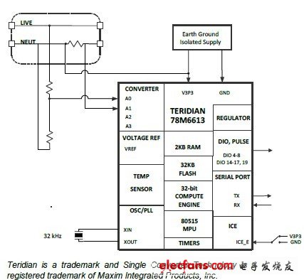 The Teridian? 78M6613 is a highly integrated IC for simplified implementation of single-phase AC power measurement into power supplies, smart appliances, and other applications with embedded AC load monitoring and control. It is packaged in a small, 5mm x 5mm, 32-pin QFN package for optimal space savings.
