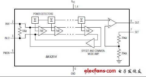 The MAX2014 complete multistage logarithmic amplifier isdesigned to accurately convert radio-frequency (RF) signalpower in the 50MHz to 1000MHz frequency range toan equivalent DC voltage. The outstanding dynamic rangeand precision over temperature of this log amplifier make itparticularly useful for a variety of base-station and otherwireless applications, including automatic gain control(AGC),transmitter power measurements, and receivedsignal-strength indication (RSSI) for terminal devices.