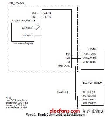 The Virtex?-4 user access register (USR_ACCESS_VIRTEX4) is a 32-bit register thatprovides direct access to bitstream data by the FPGA fabric. It is useful for loadingPowerPC? 405 (PPC405) processor caches and/or other data into the FPGA after the FPGAhas been configured, thus achieving partial reconfiguration. The USR_ACCESS_VIRTEX4register is programmed through the bitstream with a command that writes a series of 32-bitwords.