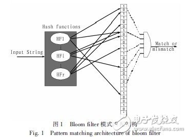 ?深度包檢測(cè)技術(shù)通過(guò)對(duì)數(shù)據(jù)包內(nèi)容的深入掃描和檢測(cè),能夠有效識(shí)別出隱藏在數(shù)據(jù)包有效載荷內(nèi)的非法數(shù)據(jù),但該技術(shù)存在功耗非常大的缺點(diǎn)。針對(duì)該問(wèn)題,提出了采用Bloom Filter(布隆過(guò)濾器)進(jìn)行字符串模糊匹配方式,利用Bloom Filter將信息流中大部分正常流量過(guò)濾掉,從而減輕了后端的字符串精確匹配的壓力,降低了系統(tǒng)功耗,大大提高了處理速度。