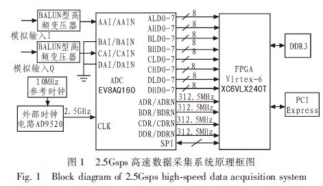 針對某高速實時頻譜儀中的高速模數(shù)轉(zhuǎn)換器(ADC)的應(yīng)用,基于信號采集系統(tǒng)硬件平臺,介紹了一種最大采樣率可達(dá)5 Gbps的高速8位A/D轉(zhuǎn)換器EV8AQ160。該器件內(nèi)部由4路并行的ADC構(gòu)成,各路ADC可并行工作也可交錯工作。詳細(xì)描述了EV8AQ160在交錯模式下的工作原理,介紹了其在某雙通道高速信號采集系統(tǒng)中的應(yīng)用,給出了EV8AQ160與Xilinx公司 Virtex-6 FPGA的接口設(shè)計方案以及系統(tǒng)結(jié)構(gòu)框圖,并用ISE的在線邏輯分析儀(ChipScope Pro)測試了ADC性能。把ADC輸出的數(shù)據(jù)存儲在DDR3中,然后進(jìn)行FFT變換,進(jìn)而分析ADC的信噪比及有效位數(shù),實測表明整體指標(biāo)達(dá)到設(shè)計要求。