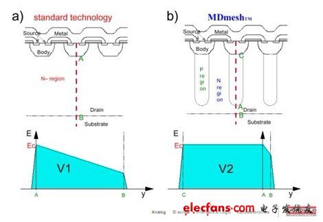 看到不少網(wǎng)友對COOLMOS感興趣,把自己收集整理的資料、個人理解發(fā)出來,與大家共享。個人理解不一定完全正確,僅供參考。COOLMOS(super junction)原理,與普通VDMOS的差異如下: