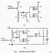 功率MOSFET屬于電壓型控制器件,只要柵極和源極之間施加的電壓超過(guò)其閾值電壓就會(huì)導(dǎo)通。由于MOSFET存在結(jié)電容,關(guān)斷時(shí)其漏源兩端電壓的突然上升將會(huì)通過(guò)結(jié)電容在柵源兩端產(chǎn)生干擾電壓。常用的互補(bǔ)驅(qū)動(dòng)電路的關(guān)斷回路阻抗小,關(guān)斷速度較快,但它不能提供負(fù)壓,故其抗干擾性較差。為了提高電路的抗干擾性,可在此種驅(qū)動(dòng)電路的基礎(chǔ)上增加一級(jí)由V1、V2、R組成的電路,產(chǎn)生一個(gè)負(fù)壓,電路原理圖如圖2(a)所示.