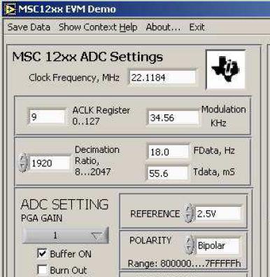 MSC12xx 演示程序是用美國國家儀器公司(National Instruments Corporation) 獨創(chuàng)的編程語言LabVIEW™編寫的可執(zhí)行文件。本應用手冊描述了如何安裝MSC12xx 演示程序并將其與用于MSC12xx 系列微控制器的下列支持評估模塊(EVM) 配合使用:MSC1200EVM, MSC1210EVM, MSC1210-DAQ-EVM 和MSC1211EVM。要安裝MSC12xx 演示程序,請將MSC CD-ROM 裝入您的PC 中。在此CD 上找到ADC Demo_LabView 目錄,然后雙擊文件setup.exe。默認設置會將一個圖標(MSC12xx Demo) 添加到程序列表的德州儀器(TI) 組中。完成安裝之后,如果這是初次使用LabVIEW 運行時引擎,則需要重新啟動計算機。
