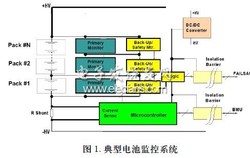 目前,混合動(dòng)力汽車(HEV)、插電式混合動(dòng)力汽車(PHEV)和純電動(dòng)汽車(EV)的開(kāi)發(fā)工作與鋰離子(Li-ion)電池的使用密不可分,許多OEM、電子設(shè)備供應(yīng)商和電池制造商探討的重點(diǎn)都集中在如何構(gòu)建最佳的電池監(jiān)控和管理系統(tǒng)。這些系統(tǒng)當(dāng)然需要一個(gè)主監(jiān)控器,它通常是一個(gè)與微控制器或電池管理單元(BMU)接口的模數(shù)轉(zhuǎn)換器(ADC),用來(lái)提供精確的測(cè)量數(shù)據(jù)并執(zhí)行電池平衡(確保充電前所有電池處于同一電平)。但是,一個(gè)爭(zhēng)論不休的話題是系統(tǒng)是否需要冗余監(jiān)控器(有時(shí)稱之為安全或備用監(jiān)控器);如果需要,它應(yīng)當(dāng)監(jiān)控什么。圖1顯示了一個(gè)典型系統(tǒng)的功能框圖。在討論冗余監(jiān)控的具體問(wèn)題之前,有必要回顧一下鋰離子電池的一些特性。