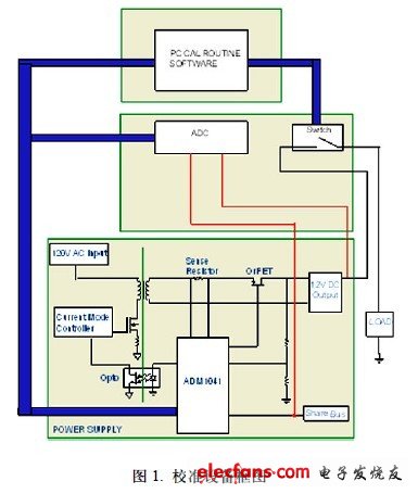 AC/DC電源變換器設(shè)計工程師使用微調(diào)電位器校準(zhǔn)差模誤差共模誤差,它們需要由操作人員在生產(chǎn)過程手工調(diào)整消除失誤差和增益誤差。這些誤差是由于非理想元件引起的,例如,流檢測電阻器和運算放大器。這是是一個浪費成本和浪費時的調(diào)整過程,最后仍會留下誤差。當(dāng)機械應(yīng)力造成微調(diào)電位的數(shù)值改變時,在工作現(xiàn)場也會出現(xiàn)誤差。新的電源控制集電路(IC)具有通過SMBbus總線對電源進行設(shè)置能夠完成這調(diào)整和校準(zhǔn)的能力。現(xiàn)在已經(jīng)開發(fā)出自動完成這種調(diào)整過程軟件校準(zhǔn)程序和接口硬件。本文介紹了一種軟件程序如何與DM1041 電源控制器IC和一個模數(shù)轉(zhuǎn)換器(ADC)一起工作來現(xiàn)這種自動校準(zhǔn)過程。它還控制一個可在校準(zhǔn)期間按需要施負(fù)載的開關(guān)。這樣保證了可靠性、可重復(fù)性、低成本和快速校準(zhǔn)和調(diào)整,同時也提高了調(diào)整精度。本文還介紹了如何能將該電源變換器設(shè)置成具有其系統(tǒng)監(jiān)視功能〔例如,過流保(OCP)〕和故障監(jiān)視功能的完整設(shè)備。圖1示出校準(zhǔn)設(shè)備的圖。