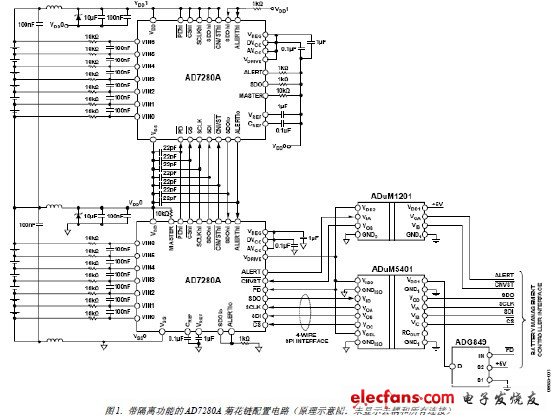 AD7280A菊花鏈從它監(jiān)控的電池單元獲得電源。ADuM5401集成一個(gè)DC/DC轉(zhuǎn)換器,用于向ADuM1201的高壓端供電,向AD7280A SPI接口提供VDRIVE電源,以及向AD7280A菊花鏈電路提供關(guān)斷信號(hào)。如果BMS低壓端的+5 V電源被拉低,則隔離器和AD7280A菊花鏈關(guān)斷。同樣,如果來(lái)自BMC的PD信號(hào)變?yōu)榈碗娖?,通過(guò)ADG849開(kāi)關(guān)路由的ADuM5401低壓電源將被拉低,這也會(huì)使隔離器和AD7280A菊花鏈發(fā)生硬件關(guān)斷。