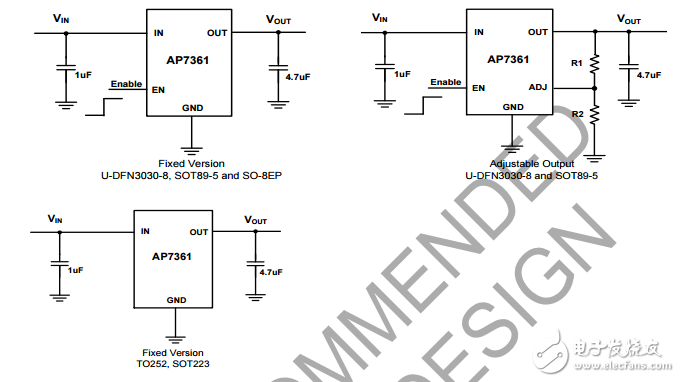 The AP7361 is a 1A, adjustable and fixed output voltage, ultra-low dropout linear regulator with enable. The device includes pass element, error amplifier, band-gap reference, current limit and thermal shutdown circuitry. The device is turned on when the EN pin is set to logic high level. The characteristics of the low dropout voltage and low quiescent current make it suitable for low to medium power applications, for example, laptop computers, audio and video applications, and battery powered devices. The typical quiescent current is approximately 70μA. Built-in current-limit and thermal-shutdown functions prevent IC from damage in fault conditions. The AP7361 is available in U-DFN3030-8, SOT89-5, SOT223, TO252 and SO-8EP package.