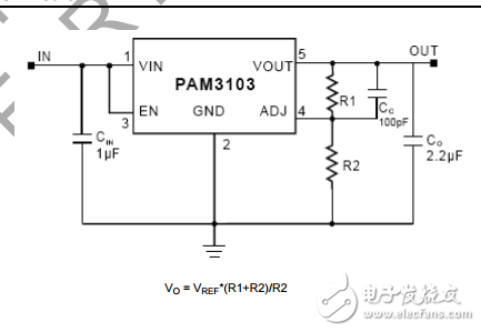 The PAM3103 is a positive, adjustable linear regulator. It features low quiescent current (65μA typ.) and low dropout voltage, making it ideal for battery powered applications. The output voltage is adjustable from 1.2V through 5V. Its high PSRR makes it useful in applications that require AC noise suppression on the input power supply. Spacesaving SOT23-5 and SOT353(SC70-5) packages are attractive for portable and handheld applications. It has both thermal shutdown and a current limit features to prevent device failure under extreme operating conditions. It is stable with an output capacitor of 2.2μF or greater.