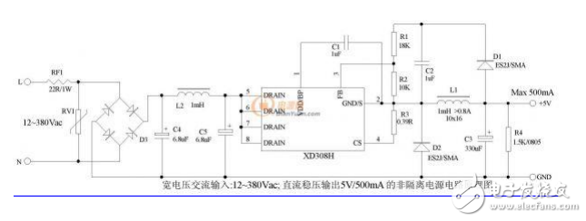 【概述】非隔離 AC-DC 電源芯片降壓電路,一般采用 BUCK 電路拓?fù)浣Y(jié)構(gòu),常見于小家電控制板電源以及工業(yè)控制電源供電。其典型電路規(guī)格包含 5V/500mA、12V/500mA 和 24V/500mA 等,滿足六級能效要求。可通過 EFT、雷擊、浪涌等可靠性測試,可通過 3C、UL、CE 等認(rèn)證。其特點是:電路簡單、BOM 成本低(外圍元件數(shù)目極少:無需變壓器、光耦),電源體積小、無音頻噪音、損耗小發(fā)熱低。 1)220V 轉(zhuǎn) 5V 降壓電路:輸入 12~380Vac,輸出 5V/500mA 如圖 1 所示的電路為一個典型的輸出為 5 V/500 mA 的非隔離電源。它通常應(yīng)用于家用電器的(電飯煲、洗衣機及其它白色家電)。此電路還適合于其它非隔離供電的應(yīng)用,比如 LED 驅(qū)動、智能電表、加熱器以及輔助電源和工業(yè)控制等。電源系統(tǒng)帶有各種保護,包括過熱保護(OTP)、VCC 欠壓閉鎖(UVLO)、過載保護(OLP)、短路保護(SCP)等。電路特點:無噪音,發(fā)熱低。