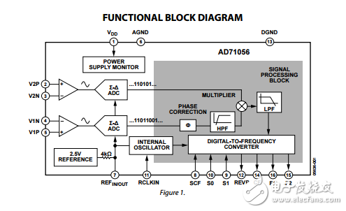 The AD710561 is a high accuracy, electrical energy metering IC with a precise oscillator circuit that serves as a clock source to the chip. The AD71056 eliminates the need for an external crystal or resonator, thus reducing the overall cost of building a meter with this IC. The chip directly interfaces with the shunt resistor. The AD71056 specifications surpass the accuracy requirements as quoted in the IEC62053-21 standard. The only analog circuitry used in the AD71056 is in the Σ-Δ ADCs and reference circuit. All other signal processing, such as multiplication and filtering, is carried out in the digital domain. This approach provides superior stability and accuracy over time and in extreme environmental conditions. The AD71056 supplies average real power information on F1 and F2, the low frequency outputs. These outputs either directly drive an electromechanical counter or interface with an MCU. The high frequency CF logic output, ideal for calibration purposes, provides instantaneous real power information. The AD71056 includes a power supply monitoring circuit on the VDD supply pin. The AD71056 remains inactive until the supply voltage on VDD reaches approximately 4 V. If the supply falls below 4 V, the AD71056 also remains inactive and the F1, F2, and CF outputs are in their nonactive modes. Internal phase matching circuitry ensures that the voltage and current channels are phase matched, and the HPF in the current channel eliminates dc offsets. An internal no load threshold ensures that the AD71056 does not exhibit creep when no load is present. The part is available in a 16-lead, narrow body SOIC package.