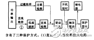 目前 , 大功率的家用功放 的主 聲道均采用 了 & ?( 電路作功率放大。 這種 電路 出現(xiàn)故障時(shí) , 其輸出端 的直流電位常常會(huì)偏 離零 電平 , 出現(xiàn)較高的正或負(fù)的直流電壓。 輸出 的直流電流流過揚(yáng)聲器的音圈時(shí) , 輕者會(huì)產(chǎn)生 固定磁場(chǎng) , 使音圈移位 , 難 以恢復(fù) , 重者會(huì)將其燒毀。 另外 , 在部分特大功率功放 中 , 由于 輸出功率非常大 , 在用戶 操作不 當(dāng) 時(shí) , 可 能 會(huì)持續(xù)輸 出數(shù)安培甚至十兒安培的峰值 電流 , 使該聲道的最大輸出功率遠(yuǎn)遠(yuǎn)超過功放的額定輸 出功率 , 致使揚(yáng)聲器燒毀。 本文 以奇聲 ? % 一 ) ? 功放 的揚(yáng)聲器保 護(hù)電路為例介紹 其工作原理。功放揚(yáng)聲器保護(hù) 電路原理框 圖如 圖 ? 所示 , 圖中