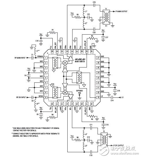 該器件在RF和LO端口集成有非平衡變壓器,此外器件還包含一個LO緩沖器、兩個雙平衡混頻器和一對差分IF輸出放大器。MAX19997A需要一個典型值為0dBm的LO驅(qū)動,電源電流保證低于420mA,以達到預期的線性度指標。