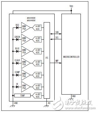 MAX44006/MAX44008兩款產(chǎn)品集6個(gè)傳感器于一身:紅光、綠光、藍(lán)光(RGB)傳感器、環(huán)境光傳感器(可見(jiàn)光)、溫度傳感器和環(huán)境紅外傳感器,采用I2C接口。這些高度集成的光傳感器以及溫度傳感器用于提高可靠性和性能。器件利用6個(gè)并行數(shù)據(jù)轉(zhuǎn)換器計(jì)算光信息,允許在非常短的時(shí)間內(nèi)同時(shí)進(jìn)行光測(cè)量。器件在RGBC + TEMP + IR模式下僅消耗15μA (MAX44006)和16μA (MAX44008)電流,可在1.7V至2.0V (MAX44006)和2.7V至5.5V (MAX44008)供電電壓下工作。