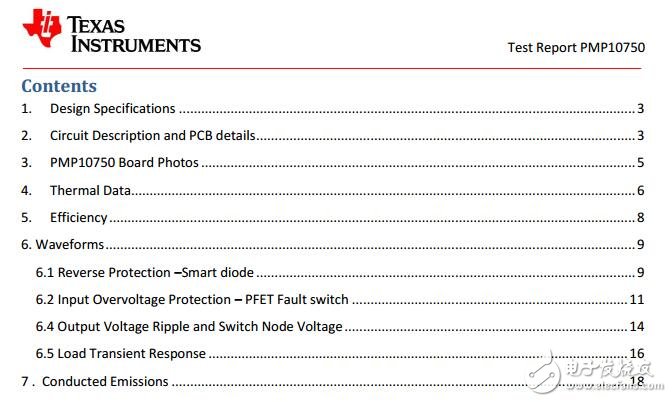 TI全英文資源:PMP10750 is a System optimized (CISPR 25 Class 5) 20W design for upstream converter used in ADAS?system with all the required automotive protection.The design has various protections such as Load dump through TVS (ISO pulse testing), Reverse Voltage?(Innovative Smart diode with very low Iq), Battery Disconnect Switch with OVP protection (PFET) and is?EMI optimized to meet Conductive EMI limits of CISPR25 Class5.Input voltage range is between 4.5V to 30V with OVP at 20V and hence will operate in wide input?voltage conditions.?LM74610 is used for Battery reverse protection which utilizes a charge pump to drive an N-channel FET?to provide a resistive path for the bypass current to flow. LM53603Q1 is used as front end DC/DC Buck?converter which is 2.2MHz switching, Synchronous rectified Wide Vin Buck Converter which can take?transient up to 42V.