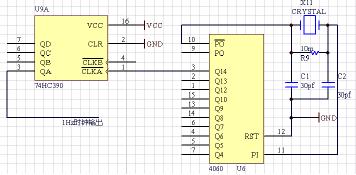 在本電路中,將clka與CD4060脈沖發(fā)生器的時鐘輸出相連,Qa即為1Hz時鐘輸出。其具體電路如圖3所示。