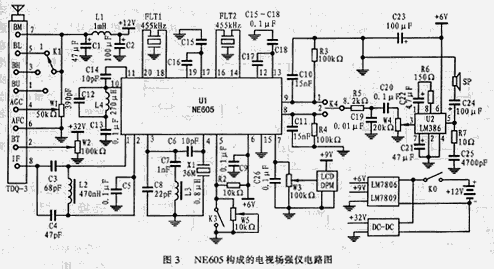 圖3所示是由NE605構(gòu)成電視場(chǎng)強(qiáng)儀電路,整個(gè)電路主要包括以下幾個(gè)部分;