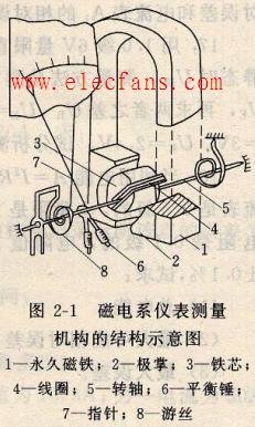,它包括各類交直流電橋等測量儀器。 一、磁電系儀表 1、結(jié)構(gòu)簡圖 2、作用原理 線圈置于永久磁鐵的氣隙磁場中,電流通過時產(chǎn)生扭轉(zhuǎn)力矩,當與游絲的反向轉(zhuǎn)矩平衡時,指針的偏轉(zhuǎn)角大小與被測電流的大小成正比。 3、用途 用途最