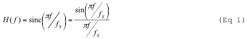 To understand the non-flat frequency response of a DAC, consider the DAC input as a train of impulses in the time domain (Figure 2a), and a corresponding spectrum in the frequency domain (Figure 2b). An actual DAC output is a "zero-order hold" (Figure 2c) that holds the voltage constant for an update period of 1/fS. In the frequency domain, this zero-order hold introduces sin(x)/x distortion (also called aperture distortion)[1]. As shown in Figure 2d, the amplitude of the output-signal spectrum is multiplied by |sin(x)/x| (the sinc envelope), where x = πf/fS. The resulting frequency response is given in equation 1 and plotted in Figure 3. Thus, aperture distortion acts like a LPF that attenuates image frequencies, but also attenuates the desired in-band signals.