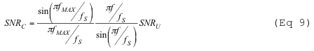 A post-equalization filter affects the DAC's SNR because it amplifies the noise at higher frequencies. Assuming the noise in an uncompensated DAC is limited by quantization noise, the output signal and noise together are attenuated by the sinx/x envelope. With a post-equalization filter, however, the output signal amplitude and noise density are constant over frequency (assuming perfect compensation). Output noise for the compensated and uncompensated DACs is obtained by integrating the noise power from near DC to fNYQUIST: