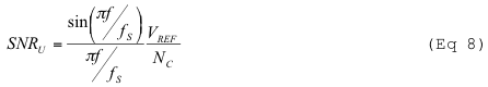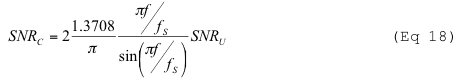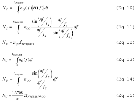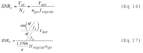 where H(f) is the frequency response for the post-equalization filter, nQ(f) is the noise power density, nQO is the unattenuated quantization noise density near DC, and NC and NU are the total noise power of the compensated and uncompensated DACs, respectively. Maximum SNR is normalized to the reference voltage VREF. Remember that fNYQUIST equals fS/2. The SNRs are then: