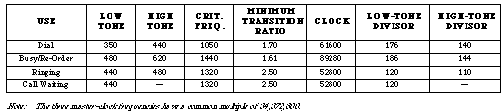 As another requirement, the ratio of the lower tone's 3rd harmonic to the filter's corner frequency must be greater than the filter's transition ratio. (Transition ratio is the edge of the stopband divided by the edge of the passband.) The parameters necessary for generating each tone pair (or tone) are summarized in the table below.