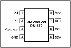 The DS1672 is a low-voltage serial timekeeping IC. The DS1672 counts seconds in a 32-bit register. Using a 32-bit binary register instead of a BCD representation of the time and date, as many real-time clocks do, can be useful where time intervals are to be measured. The DS1672 operates from a low-voltage supply (2.0V, 3.0V, or 3.3V) and includes a VBACKUP input, which allows the DS1672 to continue running the counter from a backup supply, such as a battery, while the main supply is off.The DS1672 also incorporates a trickle charger. The trickle charger register uses four bits to enable the charger. Two bits are used to select one of three current- limiting resistors and two bits to select one or zero series diodes. The trickle charger circuit is capable of charging a rechargeable battery or a large capacitor. The VBACKUP pin can also be connected to a nonrechargeable battery, such as a lithium coincell. In that case, the trickle charger should not be enabled.