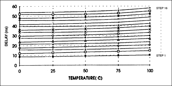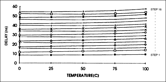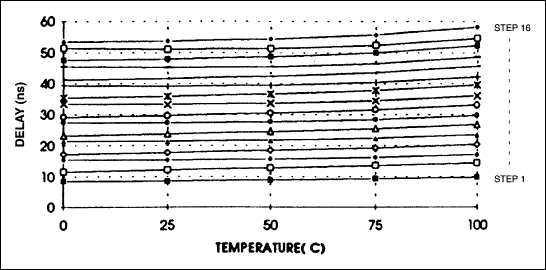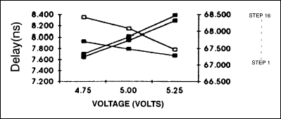 The DS1045 is a voltage compensated device whose outputs, both rising and falling edges, vary less than 300 picoseconds with voltage excursions from 4.75 to 5.25 volts. Figure 6 indicates the values for each of the 16 delay steps.