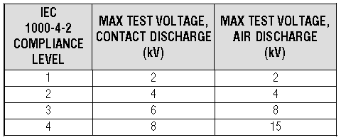 IEC 1000-4-2 defines four levels of compliance (Table 4) according to the lowest maximum voltage withstood by the I/O pins. The table defines these levels both for contact discharge and for air discharge.