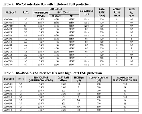 Similarly, the modified method 3015.7 does not compel products to withstand particular levels of ESD; it only defines classes of protection. New transceivers from Maxim, however, generally provide protection levels to ±15kV (Tables 2 and 3). This level allows some users to eliminate costly TransZorbs?; and other external protection circuitry.