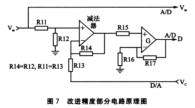 ? 誤差的引出可以用D/A來解決,把A/D讀進(jìn)來的數(shù)據(jù)再用D/A處理一次送出來,和原來的數(shù)據(jù)做一次減法就可以得到。誤差沒法直接再送回A/D,但可以將其放大后再送回,再使用68HC908QT4中的另一路A/D將放大后的誤差進(jìn)行A/D變換,MCU得到結(jié)果后縮小相同的倍數(shù),與原A/D變換結(jié)果相加,便是更精確的結(jié)果。圖6中,整個系統(tǒng)可分為壓力傳感器模塊、模擬部分、單片機部分和輸出電路部分,精度提高的關(guān)鍵在模擬部分的設(shè)計.如圖7所示。假設(shè)放大器G的放大倍數(shù)為10。A/D的性能本身并沒有提升,精度仍為R=19.61 mV/bit,這個值也就是極限值。放大10倍后,原來的最大誤差19.6l mV/bit被擴大為196.1 mV/bit,A/D處理的是放大后的數(shù)據(jù),其能力就被放大了10倍。數(shù)據(jù)處理時又會將其除以lO恢復(fù),從整體上來看就好像精度R除以10了一樣,變?yōu)?.961 mV/bit。