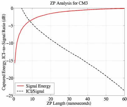 補零前綴的長度決定其所能收集的多路徑能量,補零前綴區(qū)間 (ZP window) 以外的多路徑能量則會造成載波間干擾 (Inter-Carrier-Interference,簡稱ICI),所以選擇補零前綴長度時,應將載波間干擾的影響減至最小,將收集的多路徑能量增至最大,同時減少循環(huán)前綴帶來的額外處理負擔。(圖四:補零前綴的長度如何影響接收器在4至10公尺、非可視范圍通道環(huán)境內(nèi)所收集的能量,以及補零前綴區(qū)間外多路徑能量所造成的載波間干擾)。以MB-OFDM解決方案中使用60.6 ns的補零前綴長度做比較,它在此通道環(huán)境內(nèi)所實現(xiàn)的第90個百分位通道約能收集95%的多路徑信道能量。