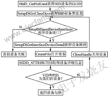 Windows為應(yīng)用程序訪問HID設(shè)備提供了強大的支持,有一整套對HID設(shè)備進行訪問的API。應(yīng)用程序要訪問設(shè)備就必須先枚舉到設(shè)備,圖4為應(yīng)用程序枚舉HID設(shè)備流程。