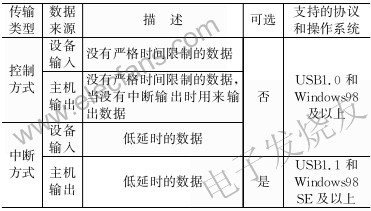中斷輸出傳輸是USB1.1規(guī)范才有的內(nèi)容,且必須獲得Windows系統(tǒng)的支持。從Windows98 SE版本開始才支持中斷輸出傳輸方式,所以如果需要中斷輸出傳輸方式的設(shè)備應(yīng)該選擇相應(yīng)的操作系統(tǒng)。表1列出了傳輸類型和相關(guān)情況。