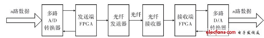 32 提出一種實(shí)時(shí)數(shù)字化光纖傳輸系統(tǒng),該系統(tǒng)分為發(fā)送端和接收端。發(fā)送端用A/D轉(zhuǎn)換器將輸入的模擬信號數(shù)字化,再用FPGA對數(shù)據(jù)進(jìn)行處理,并通過光纖傳輸。同時(shí),FPGA還控制A/D轉(zhuǎn)換器的工作。