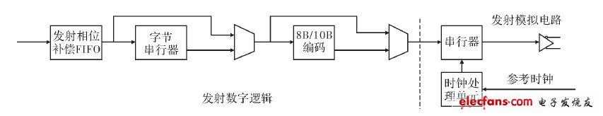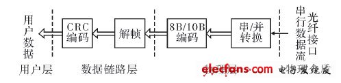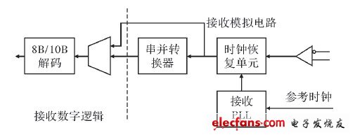 由專用差分端口輸入的高速數(shù)據(jù)經(jīng)時(shí)鐘恢復(fù)單元進(jìn)行時(shí)鐘恢復(fù),串并轉(zhuǎn)換后進(jìn)行10B/8B解碼,最后傳給FPGA進(jìn)行解幀操作。