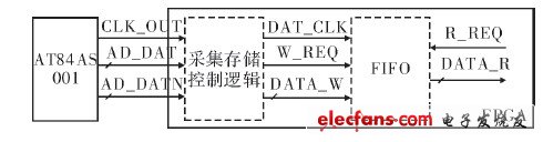 AT84AS001是ADC芯片。輸入的差分?jǐn)?shù)據(jù)直接接到FPGA的專用差分引腳。采集存儲(chǔ)控制邏輯包括LVDS接收以及數(shù)據(jù)重組等模塊,通過(guò)LVDS接收器將雙沿時(shí)鐘變?yōu)閱窝?,?shù)據(jù)重組模塊進(jìn)行數(shù)據(jù)重新排序,還原原始數(shù)據(jù)流。最后在FIFO中進(jìn)行緩存。