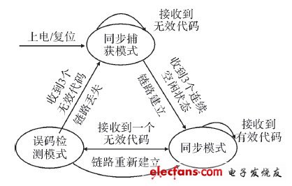 TLK1501有一個(gè)狀態(tài)機(jī),負(fù)責(zé)監(jiān)測(cè)不同的工作狀態(tài),即同步捕獲模式、同步模式和誤碼檢測(cè)模式。上電或復(fù)位后,狀態(tài)機(jī)進(jìn)入同步捕獲模式,當(dāng)接收到3個(gè)連續(xù)的IDLE碼或載波擴(kuò)展碼或1個(gè)有效數(shù)據(jù)或錯(cuò)誤延時(shí),即進(jìn)入同步模式。在同步模式下進(jìn)行數(shù)據(jù)的正常接收與發(fā)送。在這個(gè)模式下,TLK1501接收到一個(gè)無(wú)效代碼,狀態(tài)機(jī)立即進(jìn)入誤碼檢測(cè)模式。檢測(cè)模式收到4個(gè)連續(xù)無(wú)效代碼時(shí),TLK1501立即重新進(jìn)入捕獲模式。TLK1501同步狀態(tài)機(jī)如圖8所示。