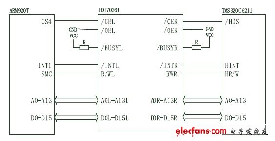 在此高速數(shù)據(jù)采集和處理系統(tǒng)中,隨著采樣數(shù)據(jù)量的增大和處理任務(wù)的增加,對(duì)數(shù)據(jù)的傳送要求越來越高,如果在兩個(gè)系統(tǒng)端口之間沒有能夠高速傳送數(shù)據(jù)的接口,將會(huì)造成數(shù)據(jù)傳送的阻塞,嚴(yán)重影響系統(tǒng)的實(shí)時(shí)性與處理數(shù)據(jù)的能力,因此此系統(tǒng)設(shè)計(jì)的重點(diǎn)之一是主從設(shè)備之間的數(shù)據(jù)通信。本文介紹用雙端口RAMIDT70261 完成TMS320C6211DSP 與嵌入式ARM920T之間的數(shù)據(jù)通信。