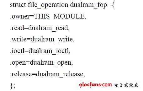 ARM完成整個(gè)系統(tǒng)的實(shí)時(shí)控制,對(duì)雙端口RAM的圖像數(shù)據(jù)進(jìn)行讀取然后經(jīng)過網(wǎng)絡(luò)傳遞給PC 機(jī),因此需要驅(qū)動(dòng)程序來實(shí)現(xiàn)雙端口RAM與ARM之間的數(shù)據(jù)通信。驅(qū)動(dòng)程序是應(yīng)用程序與硬件之間的接口,用戶可以通過驅(qū)動(dòng)程序來間接的實(shí)現(xiàn)對(duì)硬件的讀寫控制操作。雙端口RAM 的驅(qū)動(dòng)程序主要任務(wù)是讀雙端口RAM 數(shù)據(jù)到用戶空間、把用戶空間命令寫入雙端口RAM 相應(yīng)地址以及相應(yīng)雙端口RAM 產(chǎn)生的中斷。在驅(qū)動(dòng)程序中,最主要的結(jié)構(gòu)便是file_operation,在里面包含了對(duì)文件的打開、關(guān)閉、讀寫和其他控制函數(shù),file_operation 結(jié)構(gòu)如下: