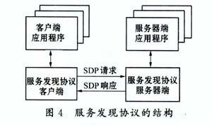 服務(wù)發(fā)現(xiàn)協(xié)議工作于L2CAP上,使用L2CAP提供的基于連接的工作方式。它可劃分為兩個(gè)部分 ,如圖4所示。圖中服務(wù)發(fā)現(xiàn)協(xié)議客戶端部分和服務(wù)發(fā)現(xiàn)協(xié)議服務(wù)器端部分是在不同藍(lán)牙設(shè)備上工作的。需要請(qǐng)求服務(wù)的藍(lán)牙設(shè)備運(yùn)行服務(wù)發(fā)現(xiàn)協(xié)議客戶端部分,提供服務(wù)的藍(lán)牙設(shè)備運(yùn)行服務(wù)發(fā)現(xiàn)協(xié)議服務(wù)器端部分。一個(gè)藍(lán)牙設(shè)備視其情況可同時(shí)含有服務(wù)器端部分和客戶端部分。在客戶端,客戶端應(yīng)用程序發(fā)出服務(wù)發(fā)現(xiàn)請(qǐng)求。在服務(wù)器端,服務(wù)器端應(yīng)用程序?qū)⑵涓黜?xiàng)服務(wù)屬性注冊(cè)到服務(wù)器中。服務(wù)發(fā)現(xiàn)協(xié)議根據(jù)服務(wù)類型來(lái)尋找服務(wù),即一個(gè)藍(lán)牙設(shè)備A通過(guò)告訴另一個(gè)藍(lán)牙設(shè)備B它想要找的服務(wù)類型來(lái)讓設(shè)備B將滿足要求的服務(wù)記錄返回給設(shè)備A。接著,設(shè)備A在返回的服務(wù)記錄中找出有用的信息。在藍(lán)牙PSTN電話網(wǎng)關(guān)的應(yīng)用中,網(wǎng)關(guān)作為SDP中的服務(wù)器端上層的應(yīng)用,需要在初始化的時(shí)候就將協(xié)議中規(guī)定好的服務(wù)屬性注冊(cè)到SDP服務(wù)器中去。終端可以在建立邏輯鏈路之前通過(guò)SDP過(guò)程來(lái)發(fā)現(xiàn)網(wǎng)關(guān)所提供的服務(wù)并與之建立邏輯鏈路。