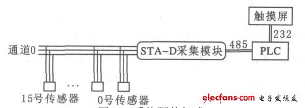 溫度監(jiān)控部分系統(tǒng)的硬件由DS18b20 型數(shù)字溫度傳感器、采集模塊、FX2N 系列PLC、FX2N-485-BD、HITECH 觸摸屏組成, 其結(jié)構如圖1 所示。