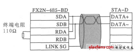 本系統(tǒng)采用的STA-D 溫度采集模塊, 是一種遠程數(shù)字化溫度采集系統(tǒng), 有10 個通道, 每個通道最多可以掛接16 個DS18b20 型數(shù)字溫度傳感器,總共可以監(jiān)控160 個點的溫度, 以RS485 方式同上位機通訊, 通信協(xié)議為標準Modbus 協(xié)議, 波特率為9 600 bps, 與上位機通信距離最大為1 200 m, 工作電源為12 ~ 24 V, 工作溫度為- 20 ~ 75 ℃。 與FX2N??485??BD 采用兩線制的485 連線方式( 圖2) ,接線要使用規(guī)范的屏蔽線。