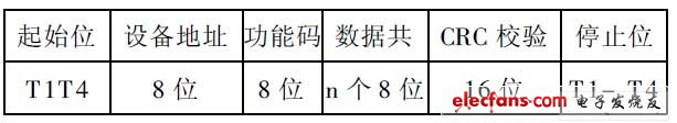 使用RTU 模式時, 消息發(fā)送至少要以3. 5 個字符時間的停頓間隔開始, 如圖3 的T1- T 2- T 3- T 4 所示。 傳輸?shù)牡谝粋€域是設備地址, 可以使用的傳輸字符是十六進制數(shù)值。 通信期間, 網(wǎng)絡設備不斷偵測網(wǎng)絡總線, 包括停頓間隔時間內(nèi), 當?shù)谝粋€域( 地址域) 接收到, 每個設備都進行解碼以判斷是否發(fā)往自己的。 在最后一個傳輸字符之后, 至少要有3. 5 個字符時間的停頓以標定消息的結(jié)束, 之后可開始新的消息傳輸。典型的消息幀如圖3 所示。 使用RT U 模式, 消息包括了一個基于CRC 方法的錯誤檢測域. CRC 域檢測了整個消息的內(nèi)容。