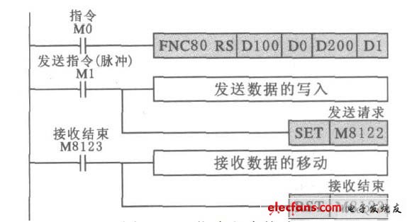 考慮到操作的方便性, 在系統(tǒng)初次安裝時, 先在PC 機上用上位機軟件將所有傳感器的ID 搜索出來, 然后按實際安裝位置給每個傳感器編號, 讀溫度測試傳感器是否工作正常。在PLC 上使用Mo dbus協(xié)議通信時首先要對通信格式進行設定, 即對D8120 寄存器進行寫操作, 在本系統(tǒng)條件下設置為0C87 , 即數(shù)據(jù)長度為8 位, 無校驗, 無起始位與停止位, 波特率9 600 bps。 修改D8120 設置后, 確保通斷PLC 電源一次。 再用RS 指令進行數(shù)據(jù)的傳輸, 相關程序格式如圖4 所示。