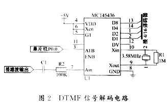 本系統(tǒng)采用的是Motorola公司的高性能DTMF接收器MC145436作為解碼的核心,如圖2所示。