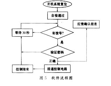軟件部分包括四大模塊:摘機(jī)復(fù)位自檢、撥號(hào)檢測(cè)和身份驗(yàn)證、控制信息反饋以及對(duì)整個(gè)系統(tǒng)的控制,軟件流程圖如圖5所示。