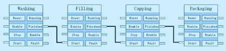 PROFInet設(shè)備之間通過DCOM模塊進行通信。在PROFInet設(shè)備連接編輯器的圖形界面中可以方便地實現(xiàn)各PROFInet設(shè)備間的連接。一個具有沖洗、灌裝、封口和包裝4個環(huán)節(jié)的飲料生產(chǎn)廠家的生產(chǎn)流程可以用4個PROFInet設(shè)備串連連接實現(xiàn)(見圖3)。